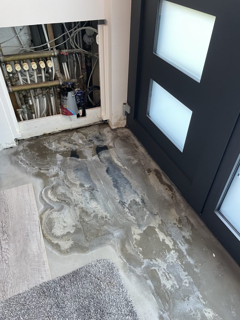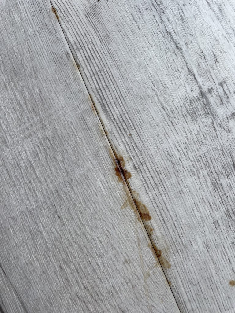 Eine Mieterin meldete dunkle Verfärbungen in der Fuge ihres Vinyl-Laminat-Bodens im Erdgeschoss. Kurz darauf war ein Mitarbeiter vor Ort, öffnete die betroffene Stelle und stellte fest: ein tropfendes Heizungsrohr war die Ursache.